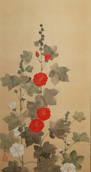 「村越向栄 十二ヶ月花卉図屏風 6月立葵」パブリックドメイン